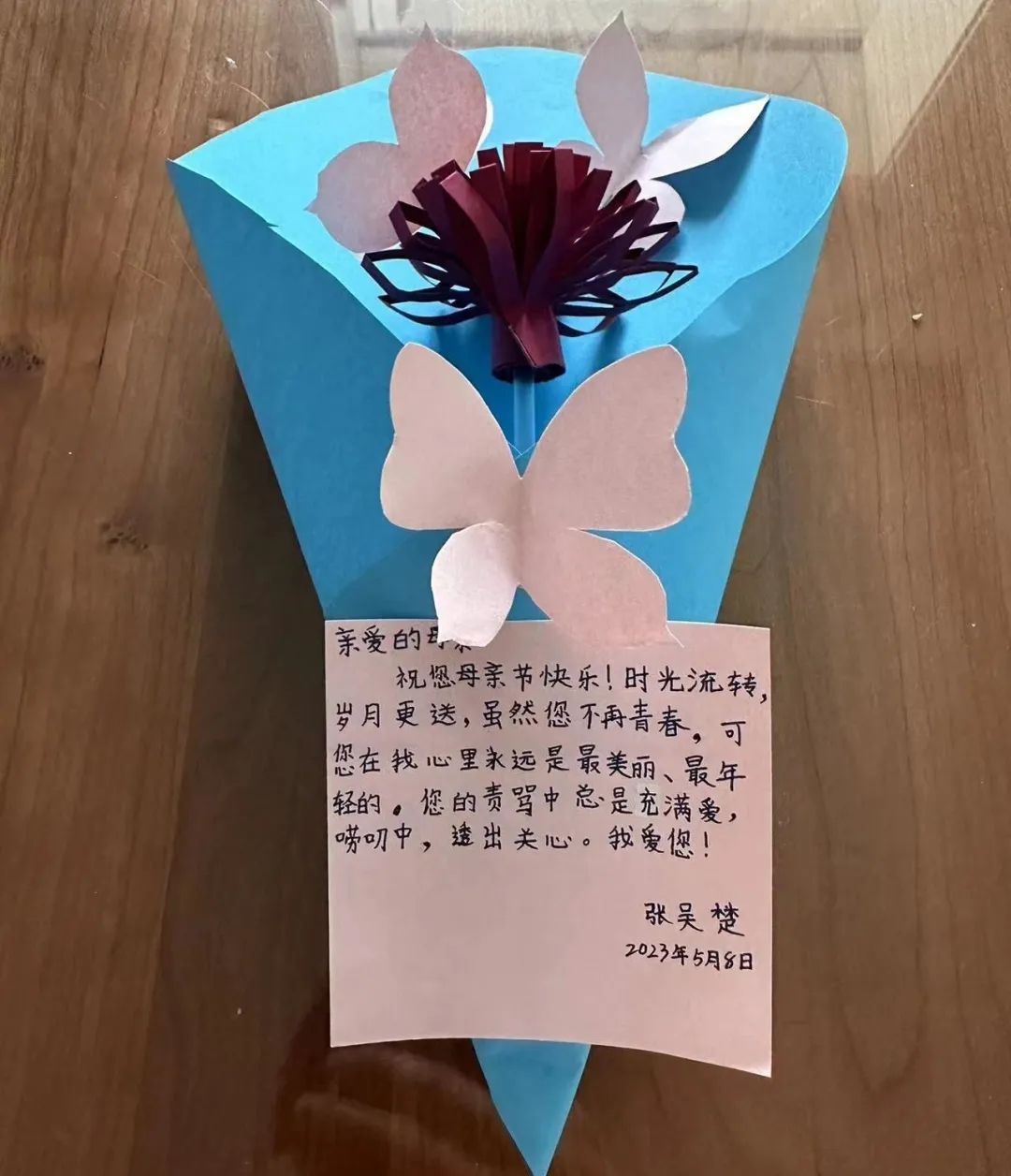 母親節(jié)這天,將自己手繪的康乃馨作為禮物送給母親。與此同時,我也收到了來自6歲的大女兒的禮物,一張漂亮的賀卡,上面用心寫著:“媽媽,我愛你!”藏在兩份禮物里的濃濃愛意,流動在這個家庭里的兩代母女間。
