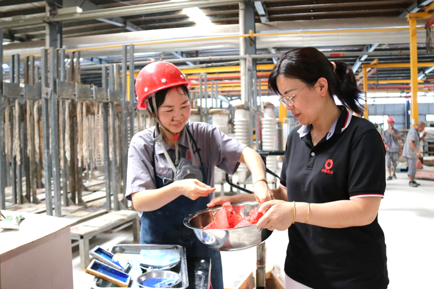 為切實做好防暑降溫工作,咸陽陶瓷院工會深入車間慰問高溫中堅守崗位的一線職工,為他們送上茉莉清茶、綠豆、冰糖等防暑降溫飲品,在炎炎夏日中送去了公司黨委和工會組織的親切關(guān)懷。