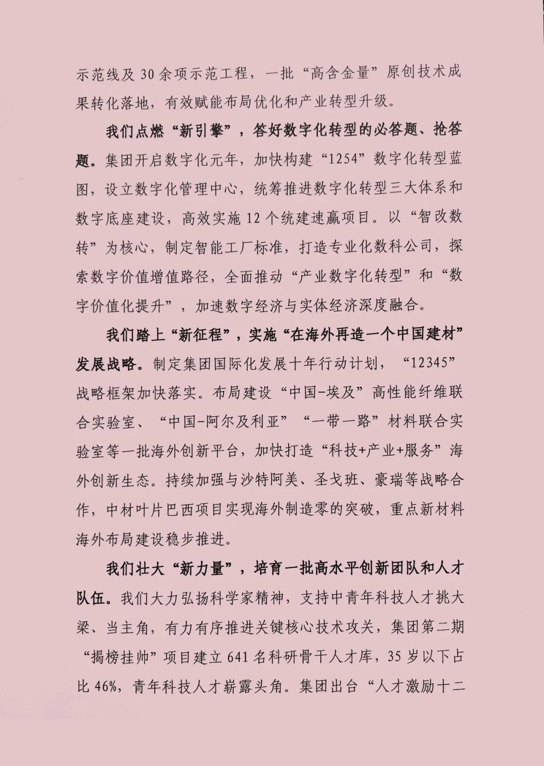 勇毅篤行向未來,奮楫揚(yáng)帆再出發(fā)。作為非金屬材料領(lǐng)域的國家隊、領(lǐng)頭羊,中國建材集團(tuán)將深入貫徹落實(shí)黨中央、國務(wù)院重大決策部署,實(shí)施創(chuàng)新驅(qū)動發(fā)展戰(zhàn)略,堅定不移做發(fā)展新質(zhì)生產(chǎn)力的開拓者、先行者、實(shí)踐者,不斷增強(qiáng)核心功能、提高核心競爭力。希望集團(tuán)廣大科技工作者進(jìn)一步提高政治站位,心系“國之大者”、打造“國之大材”,勇?lián)萍紕?chuàng)新重任,加強(qiáng)前沿顛覆性技術(shù)研究,打好關(guān)鍵核心技術(shù)攻堅戰(zhàn),用青春和熱血譜寫科技強(qiáng)國的壯麗篇章!