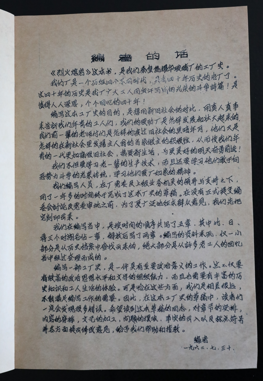1962年建廠40周年之際,廠黨委組織編撰了一本敘事體工廠史,書(shū)名為《烈火熔巖》。