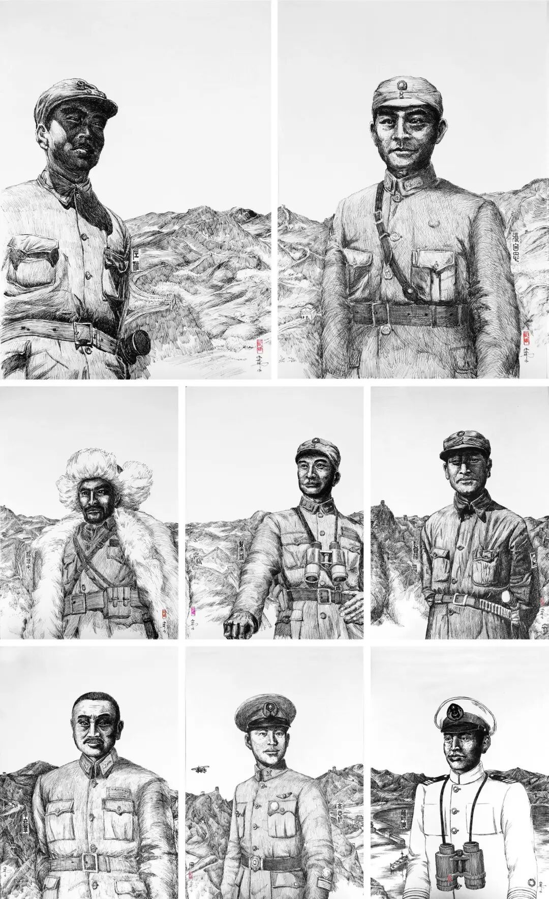 成都建材院馮延偉創(chuàng)作的鋼筆畫《抗日殉國名將系列組畫》中八位名將分別是八路軍左權(quán)、西北軍張自忠、東北抗聯(lián)楊靖宇、遠(yuǎn)征軍戴安瀾、新四軍彭雪楓、川軍王銘章、空軍高志航、海軍薩師俊。他們出身背景各有特色,正好凸顯萬眾一心眾志成城,天南海北結(jié)成廣泛愛國統(tǒng)一戰(zhàn)線共御外侮所取得的艱苦卓絕的勝利。作者致以崇高敬意,抗日殉國將士永垂不朽!