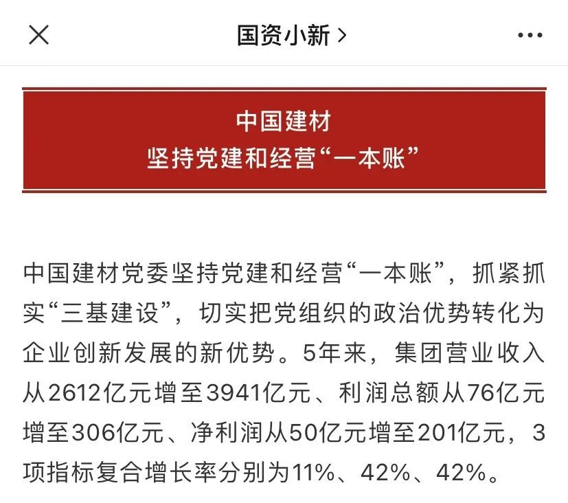 中國(guó)建材黨委堅(jiān)持黨建和經(jīng)營(yíng)“一本賬”,抓緊抓實(shí)“三基建設(shè)”,切實(shí)把黨組織的政治優(yōu)勢(shì)轉(zhuǎn)化為企業(yè)創(chuàng)新發(fā)展的新優(yōu)勢(shì)。5年來(lái),集團(tuán)營(yíng)業(yè)收入從2612億元增至3941億元、利潤(rùn)總額從76億元增至306億元、凈利潤(rùn)從50億元增至201億元,3項(xiàng)指標(biāo)復(fù)合增長(zhǎng)率分別為11%、42%、42%。