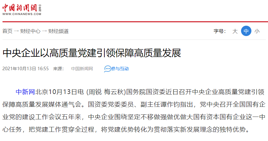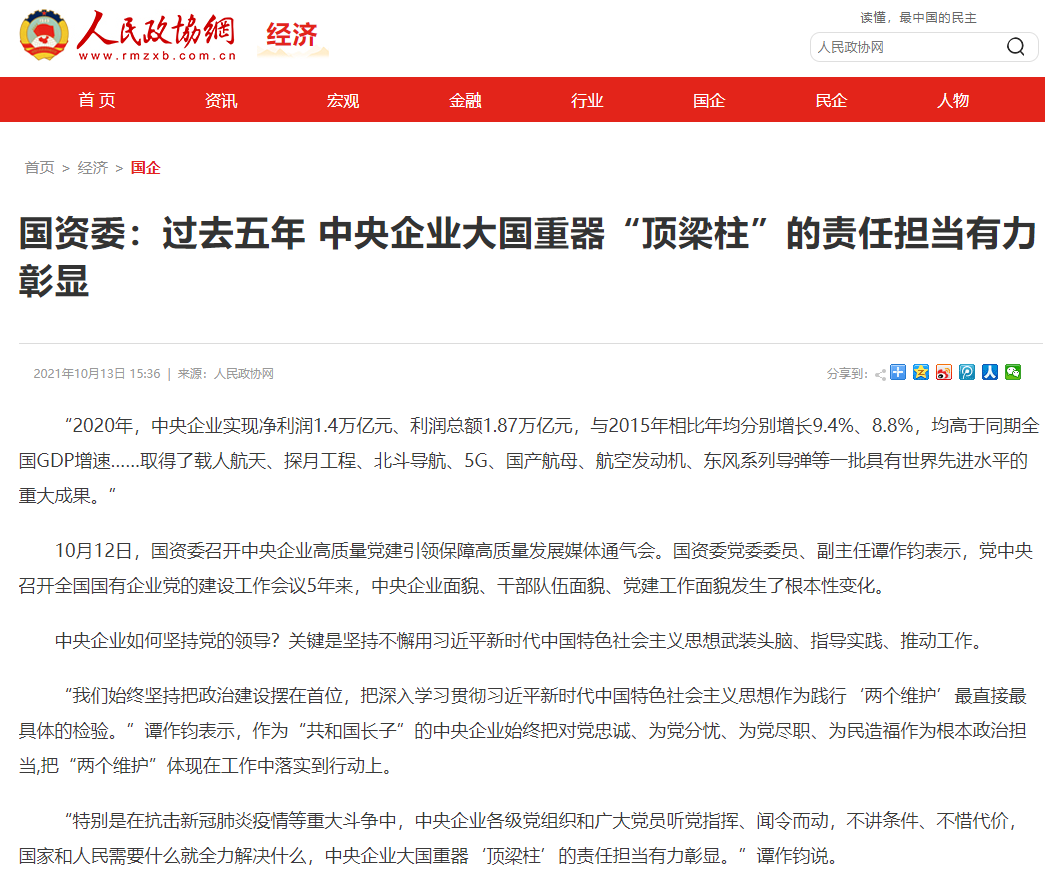 來(lái)源:央視新聞、人民日?qǐng)?bào)、國(guó)資小新、人民政協(xié)網(wǎng)、中國(guó)新聞網(wǎng)、騰訊網(wǎng)、今日頭條、澎湃 發(fā)布時(shí)間:2021-10-15