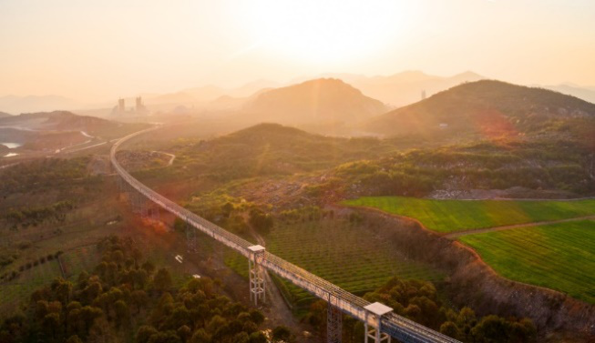 2018年8月,中國建材集團所屬南方水泥積極踐行“綠水青山就金山銀山”的理念,根據浙江長興和安徽廣德環(huán)太湖區(qū)域水泥熟料生產基地的道路運輸和環(huán)境壓力,勇?lián)熑未蛟炝艘粭l22公里的全國最長熟料“空中運輸走廊”。這條全電物流走廊具有全封閉、全架空、耐高溫等優(yōu)點,大大緩解了當?shù)毓愤\輸壓力,減少了揚塵、噪音、尾氣對環(huán)境的影響,得到政府部門和周邊居民的交口稱贊,被交通運輸部列入綠色示范項目。