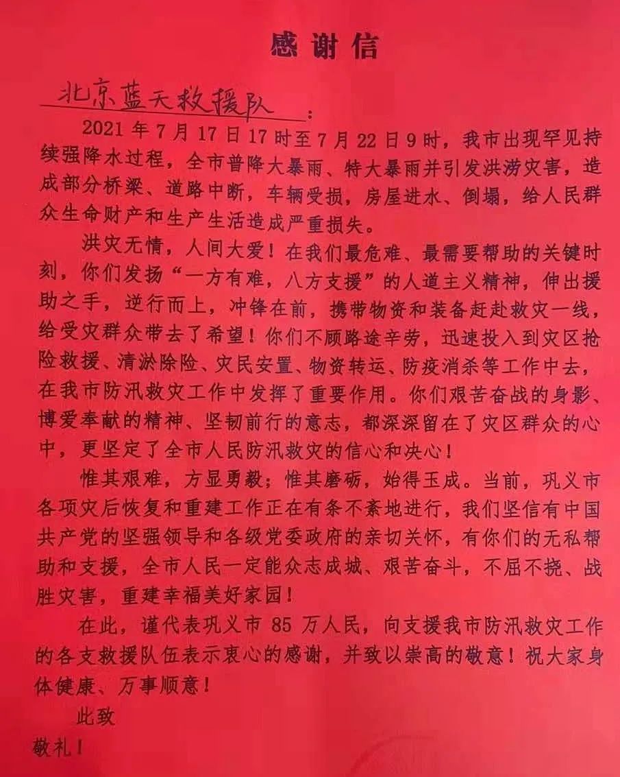 被救的河南鞏義村民們還自發(fā)為他們送來(lái)熱飯菜,這意外的溫暖讓他們熱淚盈眶,融化了所有的疲憊和艱難,留下的只有滿腔的熱血和昂揚(yáng)的斗志。在完成救援工作,準(zhǔn)備默默驅(qū)車離開(kāi)時(shí),季延所在的北京藍(lán)天救援隊(duì)收到了鞏義市防汛抗旱指揮部辦公室送來(lái)的感謝信,表達(dá)了鞏義市受災(zāi)同胞和群眾的無(wú)盡感激之情。