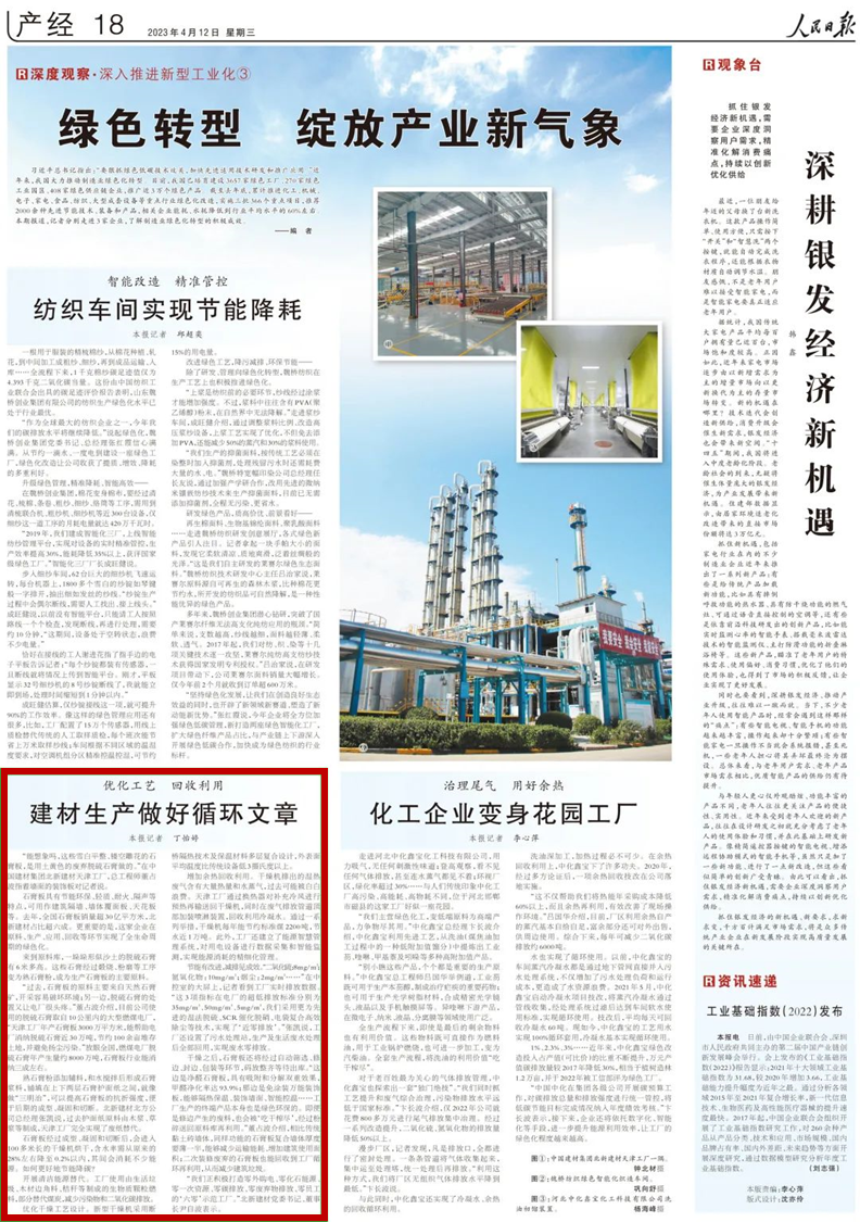 來(lái)源:人民日?qǐng)?bào)、北新建材 發(fā)布時(shí)間:2023-04-134月12日,人民日?qǐng)?bào)刊登文章《綠色轉(zhuǎn)型 綻放產(chǎn)業(yè)新氣象》,重點(diǎn)報(bào)道了北新建材天津工廠堅(jiān)持綠色制造,通過(guò)實(shí)現(xiàn)工業(yè)固廢循環(huán)利用、推行“近零排放”污染物治理技術(shù)等加快綠色發(fā)展實(shí)踐。小料現(xiàn)將內(nèi)容分享給大家。