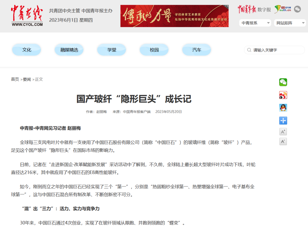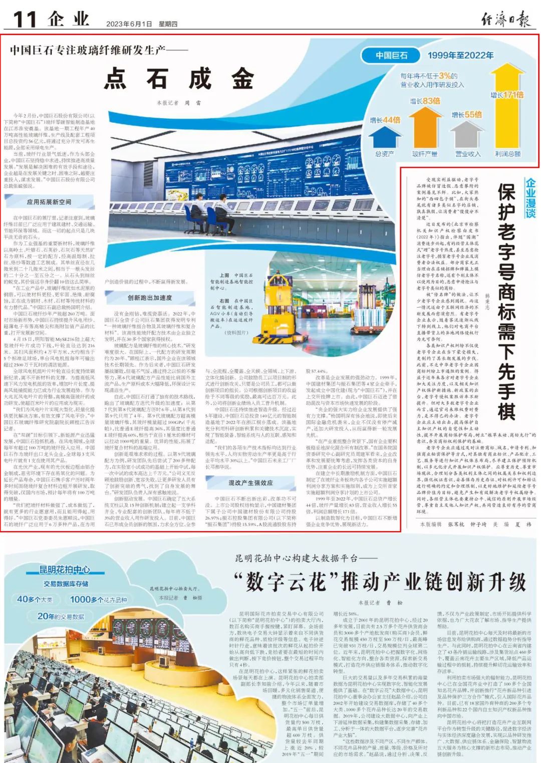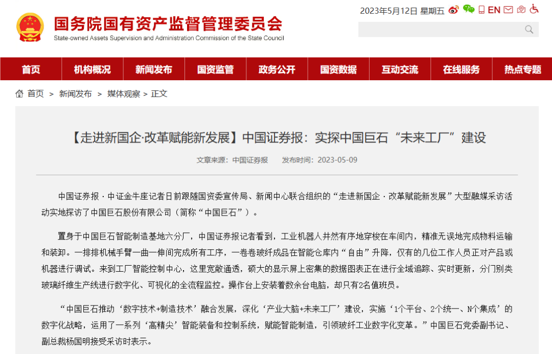 來源:國資委官方網(wǎng)站、經(jīng)濟(jì)日報(bào)、科技日報(bào)、中國青年報(bào)、工人日報(bào)、中國證券報(bào)、第一財(cái)經(jīng)、國有資產(chǎn)管理雜志、環(huán)球網(wǎng) 發(fā)布時間:2023-06-05近日,國資委宣傳局、新聞中心聯(lián)合組織“走進(jìn)新國企·改革賦能新發(fā)展”大型融媒采訪活動走進(jìn)中國建材,國資委改革辦、國資委研究中心專家和十多家中央權(quán)威主流媒體記者實(shí)地探訪了中國巨石,參觀了玻纖智能制造基地、智慧展示中心以及巨石成立三十周年成果展,紛紛報(bào)道點(diǎn)贊我們先進(jìn)的玻纖生產(chǎn)技術(shù)、智能的制造流程、豐富的產(chǎn)品種類、廣泛的應(yīng)用領(lǐng)域。