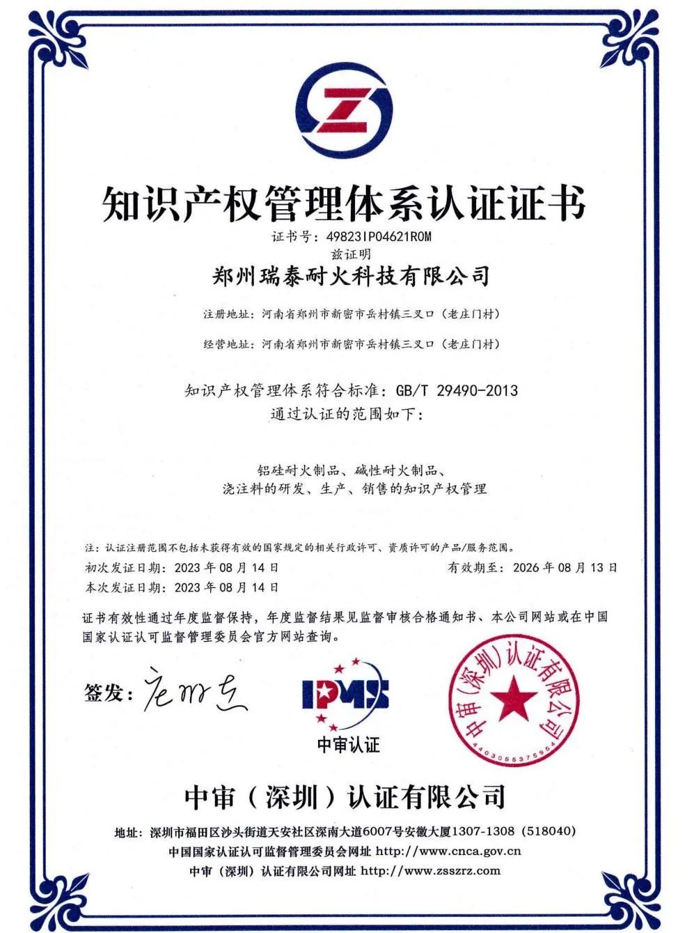 近日,鄭州瑞泰順利通過(guò)GB/T29490-2013知識(shí)產(chǎn)權(quán)管理體系認(rèn)證并取得證書(shū),這標(biāo)志著公司在知識(shí)產(chǎn)權(quán)管理規(guī)范化標(biāo)準(zhǔn)化運(yùn)行方面獲得認(rèn)可,進(jìn)一步增強(qiáng)了市場(chǎng)競(jìng)爭(zhēng)力。