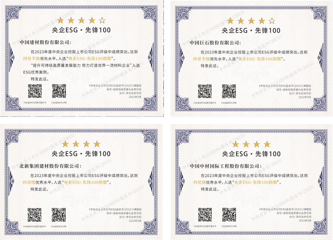 近日,《中央企業(yè)上市公司ESG藍(lán)皮書(2023)》及“央企ESG·先鋒100指數(shù)”榜單發(fā)布。集團(tuán)所屬4家上市公司中國(guó)建材股份、中國(guó)巨石、北新建材和中材國(guó)際入選了“央企ESG·先鋒100指數(shù)”,分別位于第33位,第39位,第87位以及第92位。ESG表現(xiàn)均處于四星級(jí)水平以上,是上市公司ESG發(fā)展的領(lǐng)先者。中國(guó)建材股份案例《提升可持續(xù)高質(zhì)量發(fā)展能力 努力打造世界一流材料企業(yè)》入選了《中央企業(yè)上市公司ESG藍(lán)皮書(2023)》。